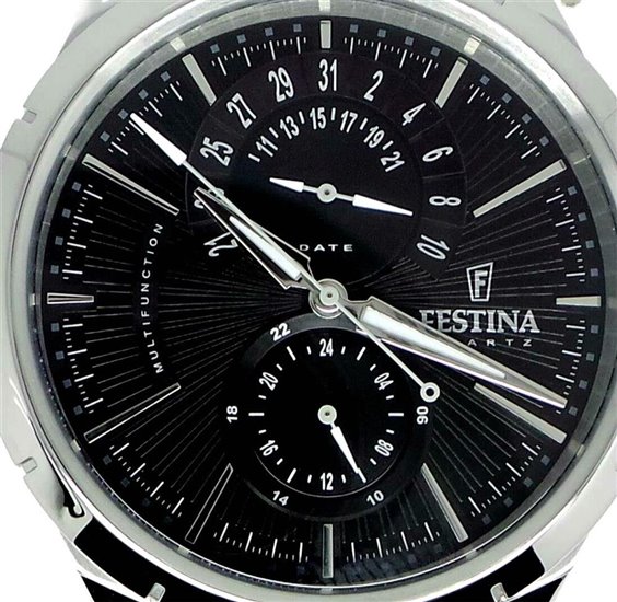 FESTINA ELEGANCE UOMO MOVIMENTO: MYOTA quarzo giappone prima scelta FUNZIONI: circolare data a ore 12/ 12/24 ore a ore 6 CARATTERISTICHE: cassa in acciaio cinturino in morbida pelle/ vetro minerale/ WR 5atm/ lancette luminose DIMENSIONI: diametro cassa mm 45