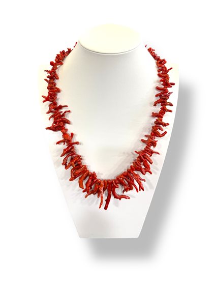 Collana in corallo rosso naturale a frange, rametti. Chiusura in argento 925 Lunghezza collana 60 cm Le foto rappresentate sono indicative gli articoli naturali lavorati a mano possono avere delle lievi differenze per forma e colore.
