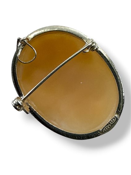 Spilla / Ciondolo in argento sterling 925/00, montatura alla romana interamente fatta a mano, cammeo su conchiglia sardonica inciso a mano raffigurante profilo di dama, dimensione cammeo 30 mm. Piccole eventuali imperfezioni dovute alla realizzazione a mano non sono considerate difetto ma una peculiarità dell’hand made.